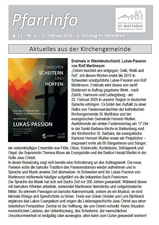 Die zutiefst berührende Aufführung der Lukas-Passion von Rolf Martinsson führte am Ersten Fastensonntag viele Mitfeiernde in der bestens gefüllten Sankt Barbara-Kirche zur Eröffnung der diesjährigen Ökumenischen Passionsandachten zusammen. Dank an die ev. Kantorei Hervest-Wulfen, den Kirchenchor St. Barbara, die Instrumentalisten und Solisten und die Dirigenten Stephan Hillnhütter und Lukas Czarnuch!